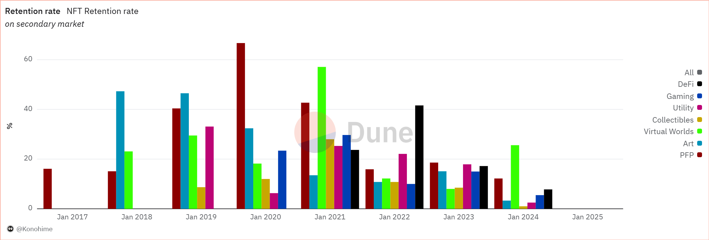 Okay, NFT buyers have changed their habits—but maybe they’re still buying the same stuff? Not really. Looking at retention rates, buyers who purchased NFTs in one category are less and less likely to come back in later years. This drop is partly due to fewer buyers overall… but mostly because people are losing money.