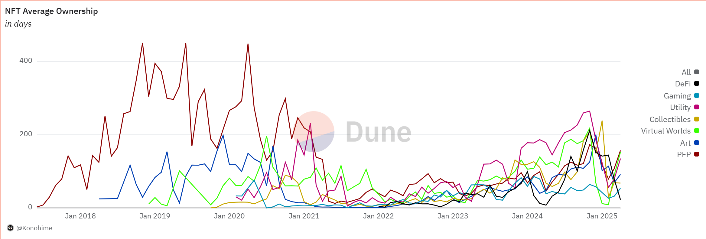 To finish this market analysis, here’s the chart of the average holding duration (in days) across categories. Since 2022, the tendency to “hold” has gone up—except for art, which seems to have decoupled from the other categories in early 2024.